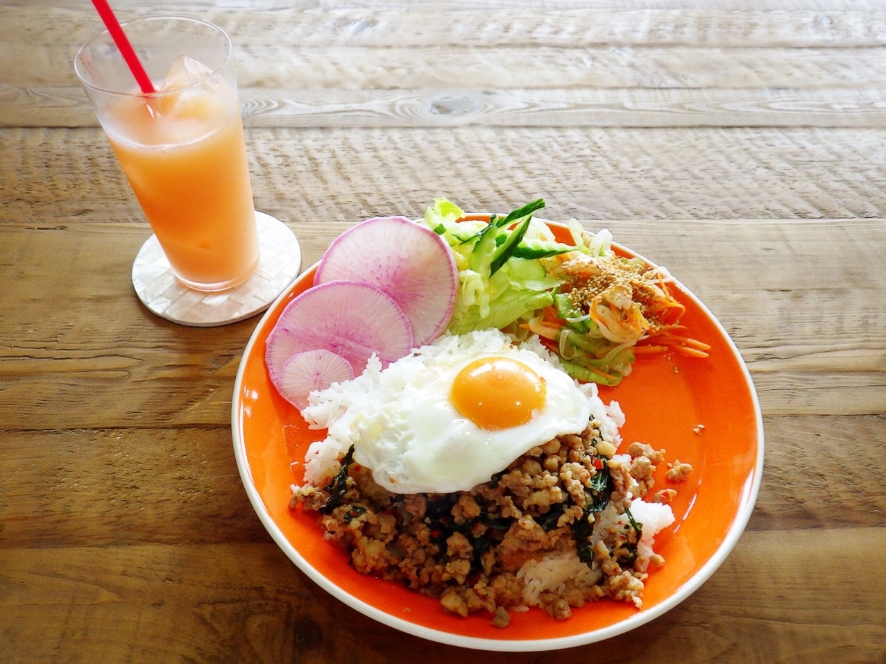 今回は、ガパオライスをいただきました。半熟の目玉焼きとガパオ(ホーリーバジル)の香りが口いっぱいに広がり、ほんのりピリ辛で唇がじんわり熱くなる感覚がクセになる味! ムー(豚肉)を使っているので、食べ応えも抜群です! ジュースはタイのブランド「CHABAA」のものを使用しています。フルーティでまろやかな味。タイ料理ビギナーの私も、すっかり魅力にハマってしまいました( *´艸`)