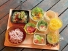 (ミニ甘酢からあげ、ローストビーフ、えびとズッキーニのバーニャカウダ風、ポテトサラダ、サラダ、ライス、スープ、ケーキデザート、ドリンク)